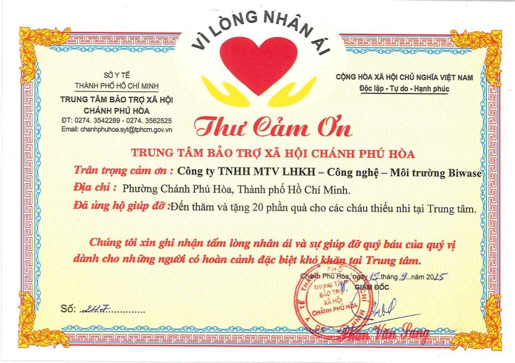 Ngày 19/9/2025, Công ty TNHH MTV Liên hợp Khoa học – Công nghệ – Môi trường Biwase (Biwase E.T.S) đã trao tặng 20 phần quà cho các em thiếu nhi có hoàn cảnh đặc biệt khó khăn đang được chăm sóc, nuôi dưỡng tại Trung tâm Bảo trợ Xã hội Chánh Phú Hòa (TP. Hồ Chí Minh).